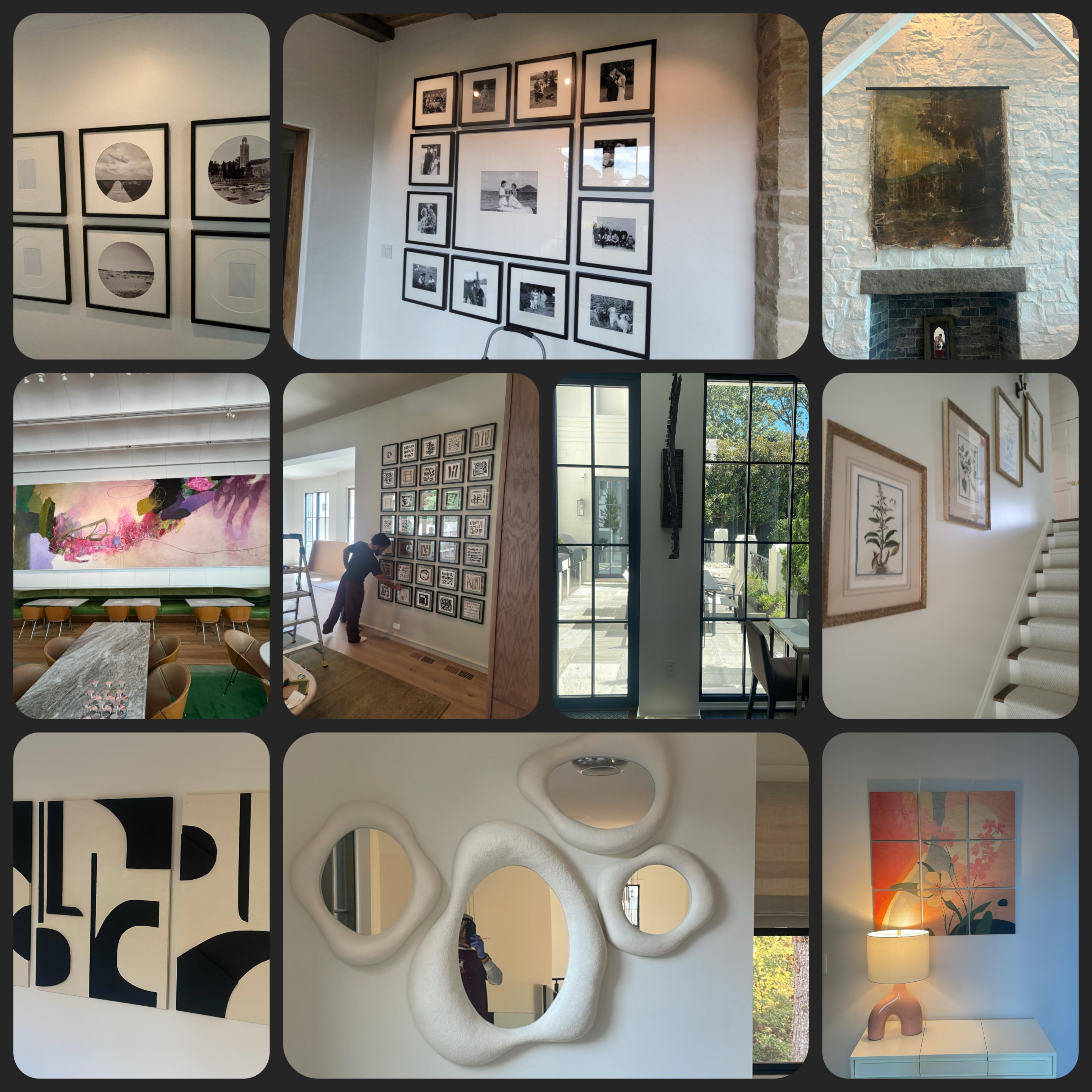 From perfectly balanced gallery walls to museum-level placements, every piece is measured, leveled, spaced, and secured with exacting care. Whether it’s a multi-frame family archive, a large-scale abstract diptych, a sculptural installation on a stairwell, or a statement mirror in marble — we install with intention.